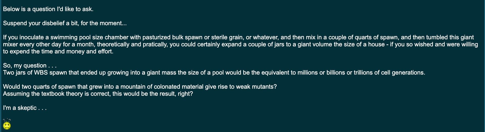 @glyph helped me realize this is probably not a good approach, because senescence can come on slowly. Its like the mycelium getting old, and just getting less vigorous – so it could lead to less fruiting, easier contaminations, slower growth – and I wouldn’t necessarily be able to know when it was “starting”. In my initial plan of just doing grain to grain transfers indefinitely, senescence might appear just as the slow chtulian shadow creep of things slowly working progressively less well.