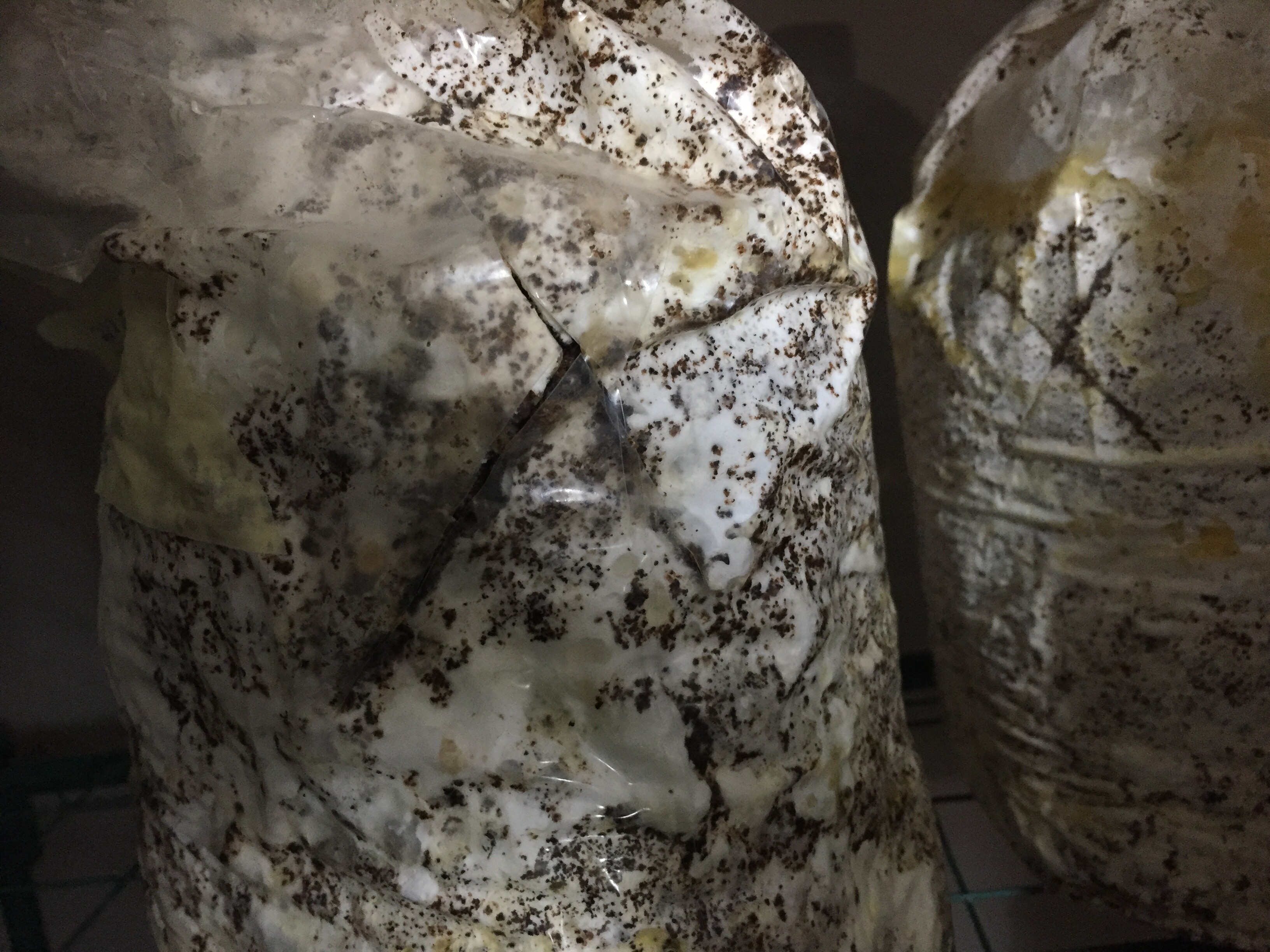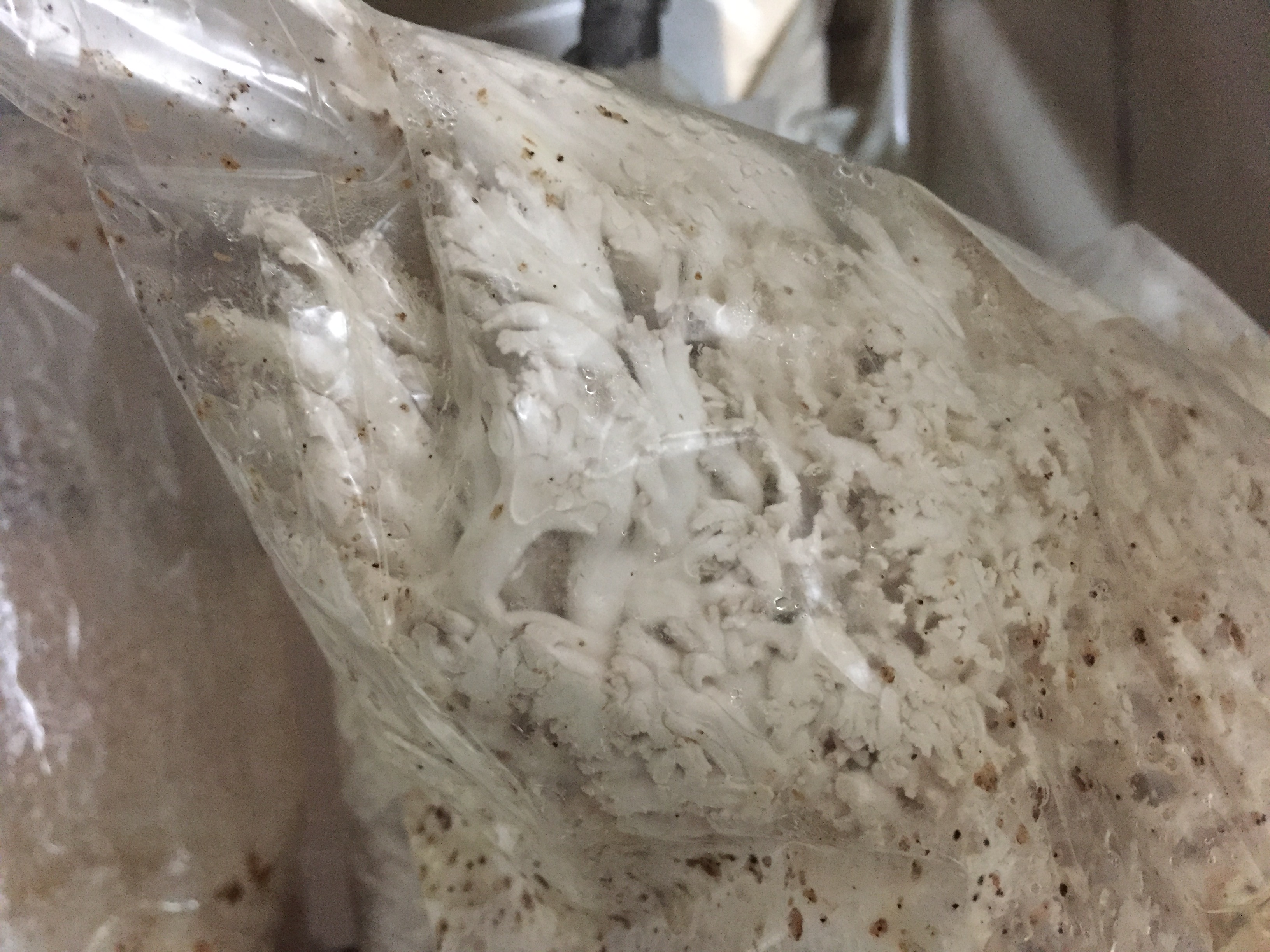 I’ve been seeing this even on bags where I cut an X in the sides, where I was hoping they would fruit out of, but the oysters seem uninterested in my ideas and have their own plan. Ale suggested if they want to grow out of the top of the bag, maybe we let them do what they want and cut open the top of the bags.
