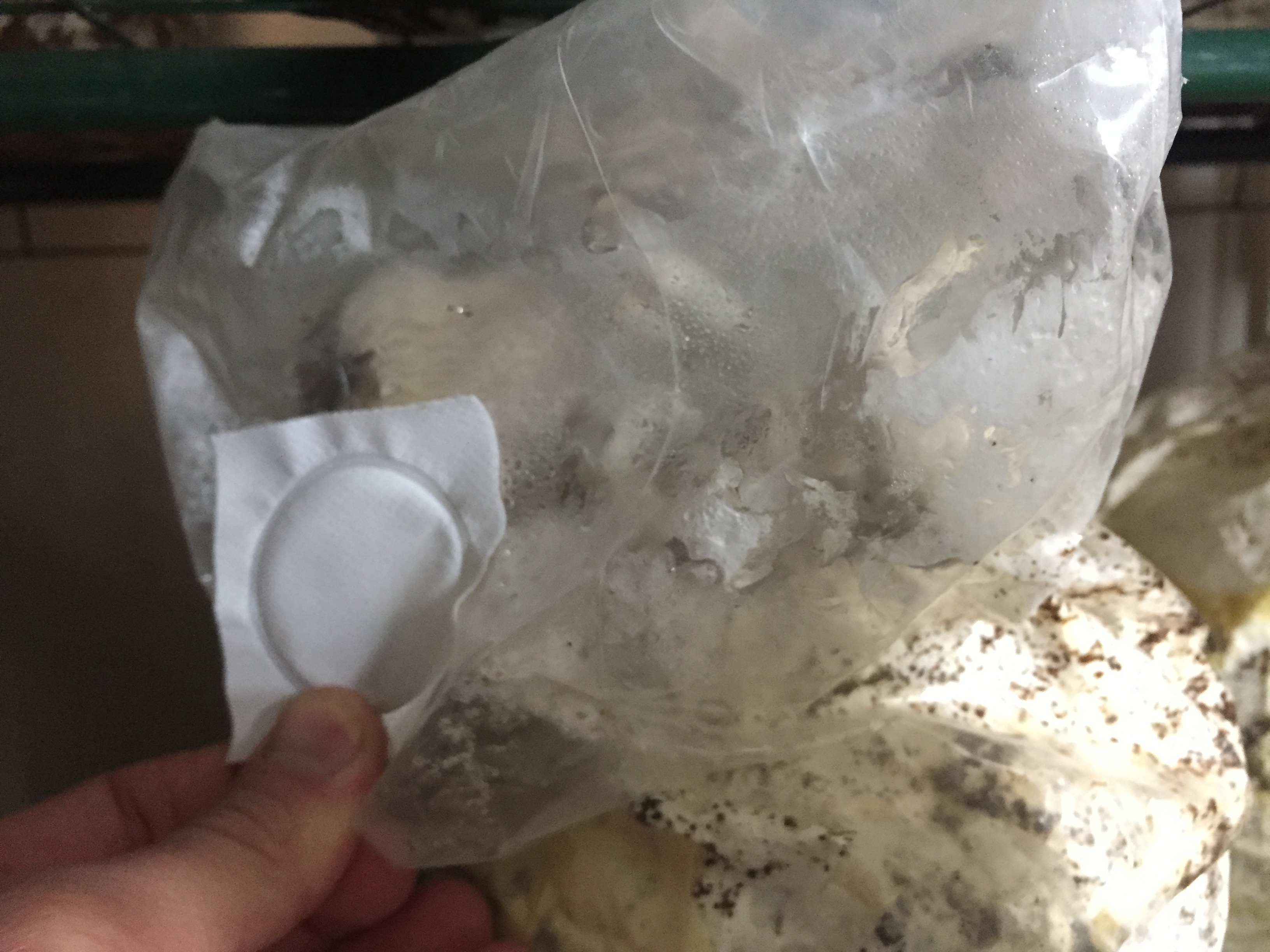 @Ale and I have both been seeing oyster bags which are fruiting inside the bag, near the top near the filter patch.